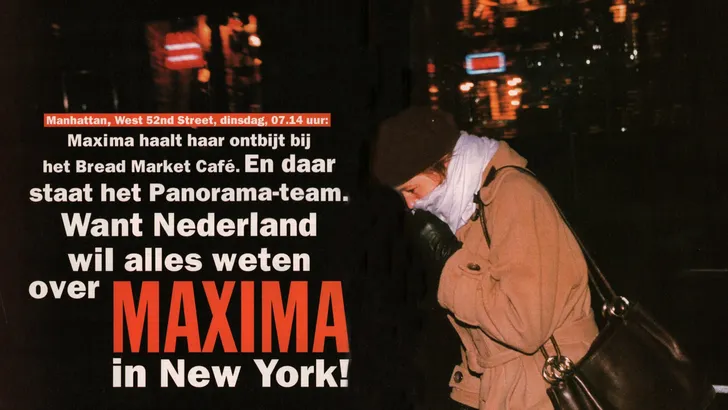 Maar de toekomstige koningin woont niet meer in het kunstenaarsoord, dus zoeken de Panorama-mannen verder. “Na enig speurwerk en een paar telefoontjes traceren we wat het huidige woonadres van Maxima moet zijn: 265 East 66th Street, inderdaad in Upper East Side. In deze moderne wolkenkrabber, op de hoek van 2nd Avenue, zou ze dan inwonen bij haar beste vriendin, Cynthia Kaufman. Deze Argentijnse rijkeluisdochter van Duitse afkomst bewoont een ruimbemeten appartement in de exclusieve miljonairstoren. De verhuizing naar deze buurt zou op dwingend initiatief van schoonmoeder Beatrix zijn gebeurd. Naar beveiligingsmaatstaven en ook op het gebied van privacy zou Maxima’s appartement in Chelsea een probleemgeval zijn.” Maar als ze bij die miljonairstoren ook geen stap verder komen, gooien de Panorama-speurders het over een andere boeg. “We besluiten om Maxima te bellen op haar werk. De receptie van de Deutsche Bank verbindt ons meteen door. Het is echter niet Maxima die de telefoon aanneemt, maar haar collega Jane. Nee, ze is even van haar plek af. Ik verwacht haar over een half uur terug. Kunt u dan terugbellen? vraagt ze vriendelijk. We weten nu in ieder geval dat ze er is. Als we tegenover de bank bij het Bread Market Café een espresso nemen, horen we van het bedienend personeel dat Maxima er een dagelijkse klant is. Ze haalt hier iedere ochtend tussen zeven en acht een grote cappuccino en een muffin, voor ze gaat werken, verklapt de goedlachse serveerster Noemi.” Meer hoeven onze Panorazzi niet te weten. In het artikel uit editie nummer 5 van het jaar 2000 lezen we de afloop. “Om 07.14 uur stapt er een dame binnen die wel héél erg veel weg heeft van Maxima Zorreguieta. Met alleen een paar donkerbruine ogen en een pluk lichtblond haar – ze draagt een modieuze baret en een warme lila sjaal vanwege de vrieskou – als herkenningspunten voelen we toch dat we beet hebben. Een café-bediende geeft een stiekeme knipoog onze kant op; het teken dat we goed zitten. Omdat het nogal druk en chaotisch is in het café, besluiten we naar buiten te gaan en haar daar op te wachten. Na een minuut of vijf komt ze, ietwat schoorvoetend, de deur uit. We aarzelen dan geen moment en vragen Maxima of ze wil poseren.