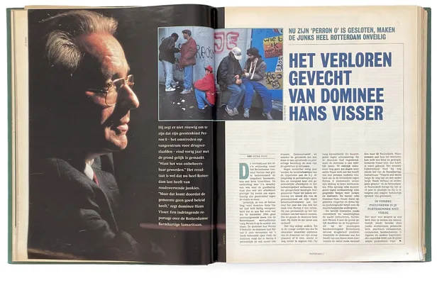 Ook dominee Visser niet, al zag hij met lede ogen aan dat zijn ‘geesteskind’, zijn bijdrage aan een betere stad en samenleving, in december 1994 de poorten moest sluiten, op last van de toenmalige burgemeester Bram Peper die een einde wilde maken aan de plek die steeds meer op een wetteloze vrijplaats begon te lijken. Een paar weken na de sluiting volgde onze verslaggever Peter Post dominee Visser in het ontredderde Rotterdam waar de kruitdampen van de ontruiming nog niet helemaal waren opgetrokken. Visser, ‘een beer van een vent die op een mountainbike door Rotterdam croste’, ving junks op in ‘zijn’ Pauluskerk, waar iedereen toen, en nu nog steeds, welkom was voor een kop koffie, een heilzaam gesprek of zelfs Bijbelles, al verdwenen de bijbels zodra hij zijn rug had gekeerd. Die werden gejat bij het leven, dat wist hij ook: