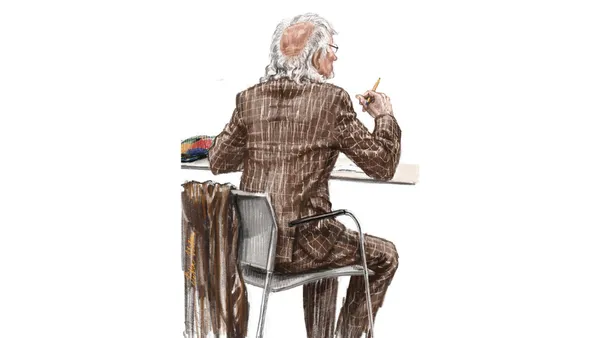 Met behoedzame tred stapt de 69-jarige Leo (“zet mij er maar met naam en toenaam in, hoor”!) de rechtszaal binnen. Zijn ingevallen gezicht roept ongewild het beeld op van een glas water op een nachtkastje, met onderin een vergeten kunstgebit of minstens de helft daarvan. De glanzend kale plek bovenop zijn schedel wordt omzoomd door lange, witgrijze, springerige haren. Zijn wollen kostuum valt ruim om zijn iele lijf.