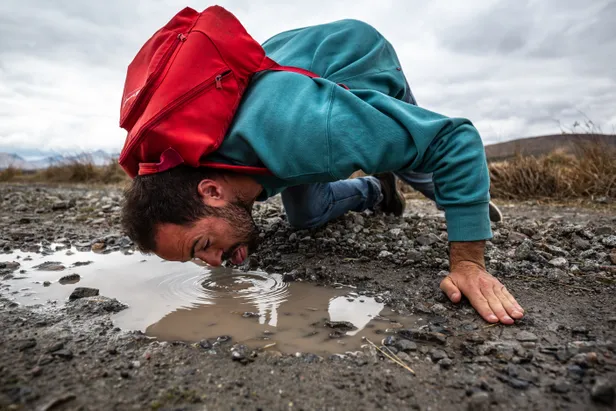 Na een vluchtige instructie van Siegurd – “Let op je ademhaling, hoe hoger hoe kouder, doseer je watervoorraad” - gaat onze tocht van start. De eerste etappe is een onschuldig grindpad, dat ons langzaam maar zeker dichterbij de twee bergtoppen in de verte brengt. Halverwege stoppen we even bij een stromend beekje. “Hier kunnen jullie je flesjes vullen,” legt Siegurd uit. “Schoner water dat dit ga je nergens vinden. Het stroomt, het is klein en je ziet waar het vandaan komt. De kans dat er een dood hert of schaap in hetzelfde water ligt, is minimaal.” Guido uit Amsterdam stapt naar voren. “Dus we hoeven nu nog niet van onze eigen urine te drinken?” Siegurd, met opgetrokken wenkbrauwen. “Nee jongen, voorlopig nog niet.”