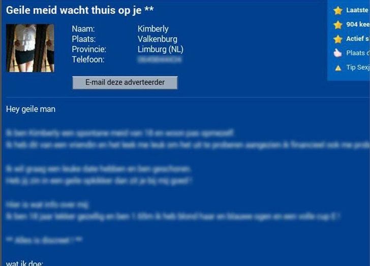 Dat dit voor Kimberly schadelijk zal zijn, deert de Kerkradenaar klaarblijkelijk niks. A. heeft dollartekens in de ogen. En die worden groter en groter als hij merkt hoeveel mannen er reageren op zijn seksadvertentie.