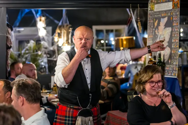 Daar staat ie dan. In zijn Schotse kilt. Het tartanstrikje, de hoge kousen, het donzen tasje bungelend voor zijn middel, het nette, zwarte colbertje erboven: verassend! Want je verwacht toch iets anders dan een volbloed Highlander voor je neus als je aanklopt bij een rijtjeshuis in omgeving van Almelo. “Ja, als je jezelf een whiskyentertainer noemt, moet je het wel goed doen, hè? Alles erop en eraan. The real deal.”
