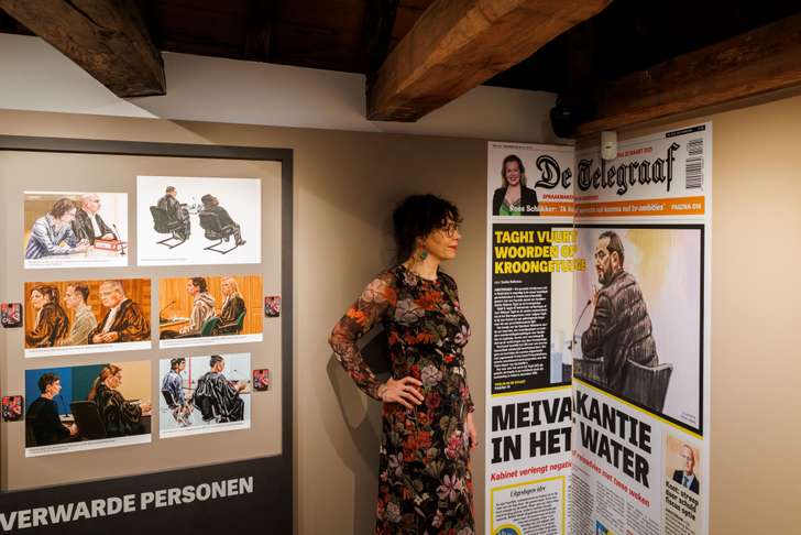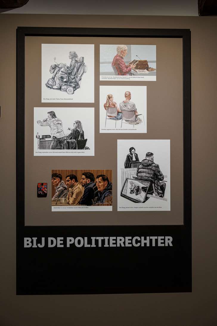Op de middelste etage van de tentoonstellingsruimte heeft het Stadsmuseum Harderwijk een rechtszaal nagebouwd. De tekeningen van Petra, onderverdeeld in verdachten, getuigen, advocaten en slachtoffers, zijn in het rechtbankmeubilair verwerkt. “Ik doe niet aan valse bescheidenheid, maar ik vind dit echt fantastisch,” zegt ze trots. “Ik hoop ook dat Kees van der Spek nog even langskomt, dan kan hij ook zien dat hij er ook opstaat.” De tekening van de getuigenis van Kees van der Spek is gemaakt tijdens de strafzaak tegen de makers van Spoorloos, waar Kees een onthullende aflevering van zijn misdaadprogramma aan besteedde. Daarin toonde hij aan dat Spoorloos, het iconische programma waarin geadopteerde mensen op zoek gaan naar hun biologische ouders, vanwege hun gebrekkige en gemakzuchtige werkwijze tal van mensen aan onbekende ouders hebben gekoppeld en zodoende vele levens hebben geruïneerd.