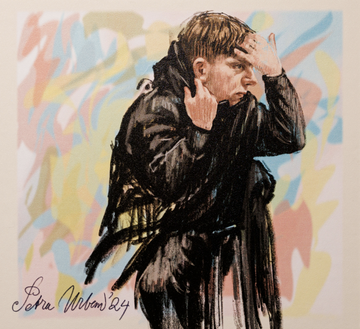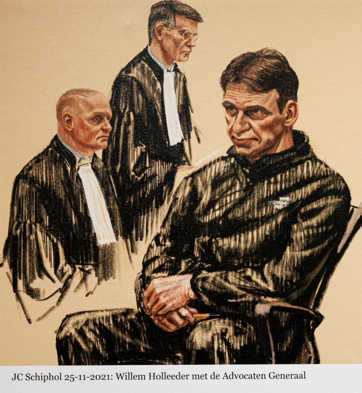 Langs de tekeningen van advocatenechtpaar Knoops en advocaat Peter Plasman volgen we het spoor van Petra omhoog en neemt de rechtbankgoeroe ons mee naar de bovenste etage van haar indrukwekkende tentoonstelling. Daar vallen de vele prenten van Willem Holleeder op. Petra: “Hij gaf me altijd een knipoog en heeft via de pakketwacht weleens gevraagd of hij de tekening mocht zien. Toen ik hem de tekening liet zien, zei hij voor de grap: Een beetje een kleine neus, hè? Daar moesten we toen om lachen.” Even verderop: “Dit is een van mijn favoriete Holleeder-prenten, omdat het gewoon een goede plaat is. Officier van justitie Koos Plooij en Holleeder staan er strak op. Holleeder heeft hier weer zijn kenmerkende, groene North Face-pak aan.”