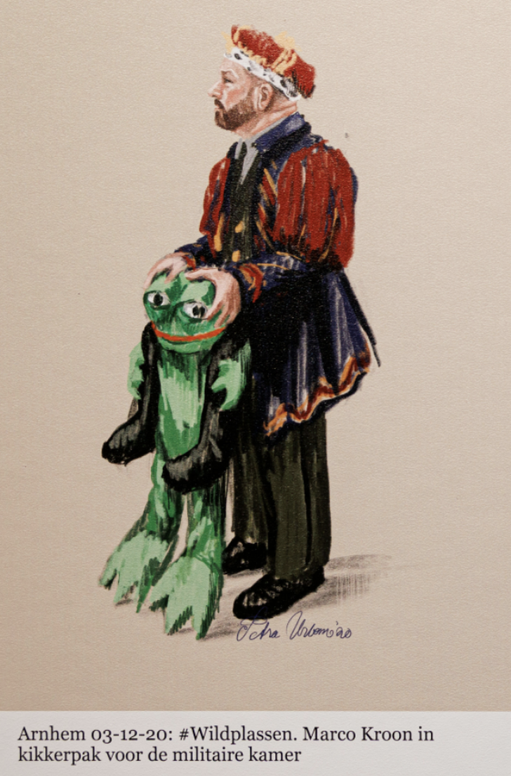 Naar alle waarschijnlijkheid was het jongetje doodgeboren en had de vrouw hem vol verdriet verstopt nabij de Sloterplas in Amsterdam. De moeder werd niet verantwoordelijk gehouden voor zijn dood, wel voor het wegmaken van het lichaam. Petra: “Er zit een mens onder die deken, dat wilde ik laten zien.” Dankzij de regelmatig in opspraak geraakte militair Marco Kroon kunnen bezoekers ondanks al het leed in de tentoonstelling toch met een lach eindigen en zich vergapen aan een tekening van Petra waarbij Kroon midden in de rechtszaal in een kikkerpak staat afgebeeld om zich te verantwoorden voor een plasincident. “Dat trok hij aan om aan te tonen dat de bewuste dame zijn ‘snikkel’ tijdens carnaval in Den Bosch niet kon zien, omdat er een kikker voor zat. Dat was wel echt hilarisch. Deze tekening heeft goede sier gemaakt.”