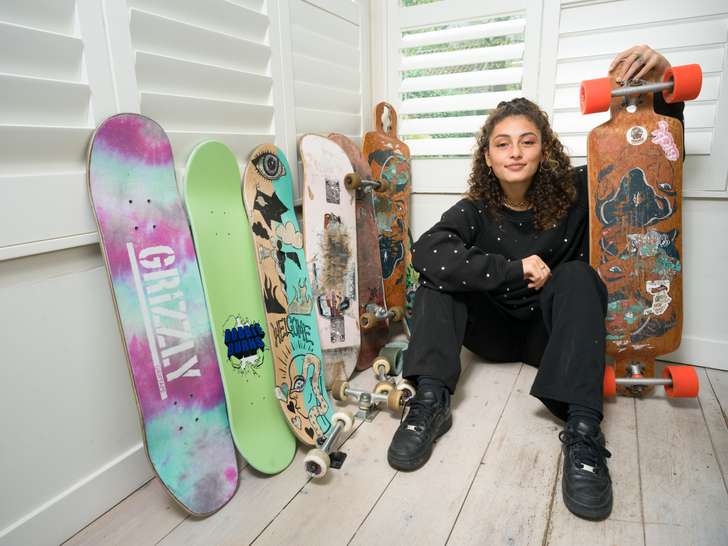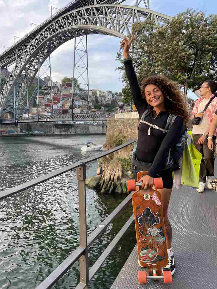 Dat ze een drang naar een exotisch leven heeft, wekt nauwelijks verbazing. Ze heeft een Caribische uitstraling, met haar enorme bos krullen, het ringetje door haar neusvleugel en de tatoeages op haar bruine huid. En dan nog skaten ook, ze kan zo in een salsa-clip, deze dochter van een Nederlandse moeder en Surinaamse vader. “Toch ben ik nog nooit in Suriname geweest, dat moet ik echt een keer gebeuren,” zegt ze. “Ik vind me zelf echt privileged dat ik hier ben geboren, maar het weer staat me niet zo aan en er is hier ook zo’n prestatiedruk, terwijl als je kijkt naar een land als Portugal, daar gaat alles in een veel lagere versnelling.”