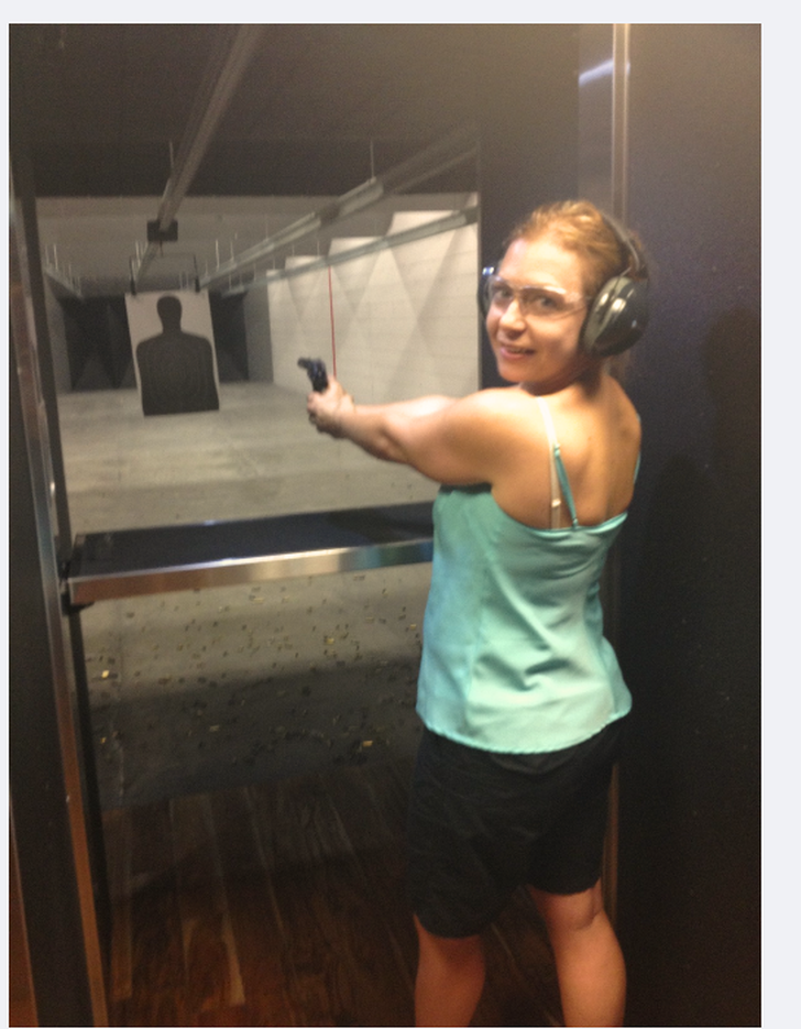 Anthony, een van mijn beste vrienden in Vegas, gaat de deur niet uit zonder zijn ‘girlfriend’: een zwarte Glock19. Volgens hem een instapmodelletje. Heeft hij altijd bij zich om zichzelf te beschermen. Nooit nodig gehad, maar ‘just in case’, als hij toevallig in minder veilige buurten moet zijn. Maar ook als we gewoon Chinees gaan eten bij Ping Pang Pong, zo heet ie echt. Ik ben er iedere keer weer door gefascineerd. En twintig jaar geleden mocht ik zelf schieten. Eerst de zwaardere broer van de Glock19: een Glock 34 met een langere loop en slede. En als toetje met een Colt Car-15 commando karabijn.