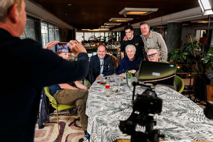 Terwijl de mannen ongegeneerd op de stoelen hangen, komt het publiek naar boven. Jawel, de podcast is voor beangstellenden toegankelijk, als ze zich vooraf aanmelden via de website. Er is plek voor wel zestien man. Gijs en Sander, twee broers van wie de een in Rotterdam woont en de ander in Alphen aan de Rijn, hebben de maandagmiddag vrijgehouden voor een live-ontmoeting met hun helden. “Ik luister de podcast regelmatig,” zegt de jongste (43) van de twee. “Mijn broer Sander (53, red.) luistert ook vaak, zo weet ik sinds een maand. Ik dacht: leuk om met z’n tweeën te gaan, pakken we een lunch, maken we er een uitje van.” Broer Sander is niet verrast met wat hij aantrof, maar dat is niet vreemd omdat hij ook op YouTube kijkt. Gijs niet. “Met beeld vind ik er eigenlijk niks aan. Luisteren is veel leuker.”