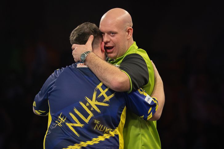 Na een jaar vol rampspoed – een echtscheiding, tegenvallende resultaten voor iemand van zijn statuur en een paar vechtpartijtjes – zou je denken dat Michael met de ziel onder zijn arm voor de camera verschijnt. Maar Van Gerwen is Raymond van Barneveld niet. Anders dan bij ‘Barney’ zit zwelgen in zelfmedelijden niet in zijn aard. Sterker nog, hoe groot de problemen van Van Gerwen dit jaar naast het dartbord ook mogen zijn: de Brabantse bravoure krijg je er met geen moker uit. Hoor maar eens hoe hij over Luke Littler en Luke Humphries praat, de twee Lukes die als enigen boven hem op de wereldranglijst staan, maar dan ook wel met een straatlengte voorsprong.