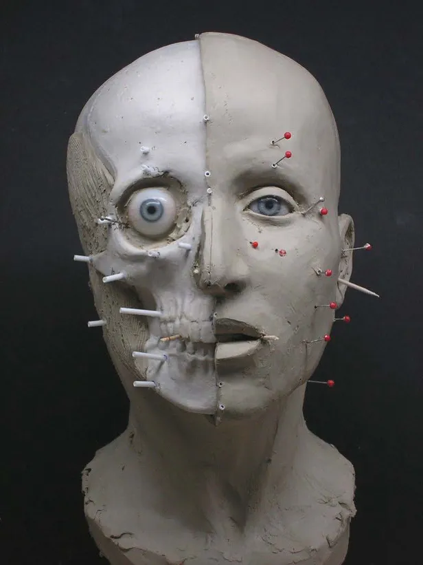 Een lange streng donker haar. Op de plek van de ogen zitten twee gaten.