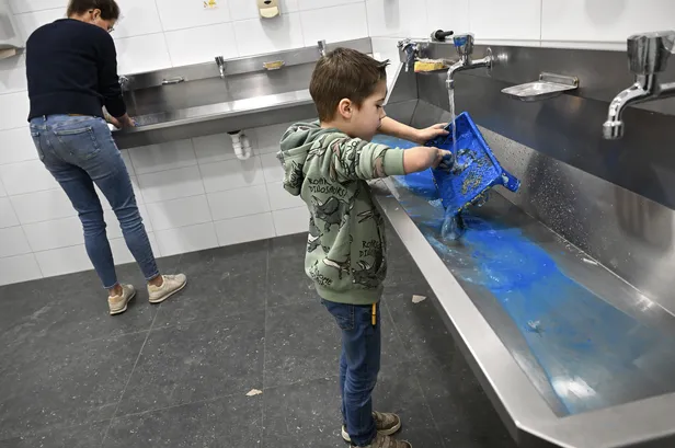 Geen smurfenbloedbad in de wasbak, deze knul staat keurig zijn verfbak uit te spoelen.