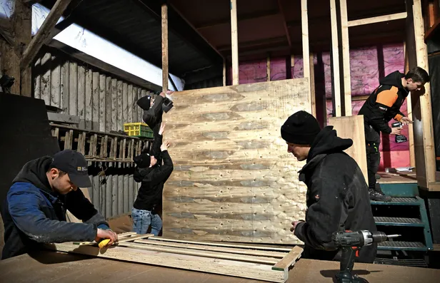 In een boerenschuur in Maasbommel timmeren de mannen hard aan hun carnavalswagen.