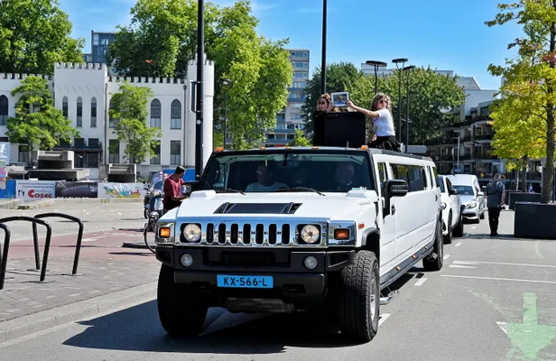Muziek, toeterende auto’s, een twaalf meter lange Hummer limousine… De rouwstoet voor Toontje trok veel bekijks in Tilburg