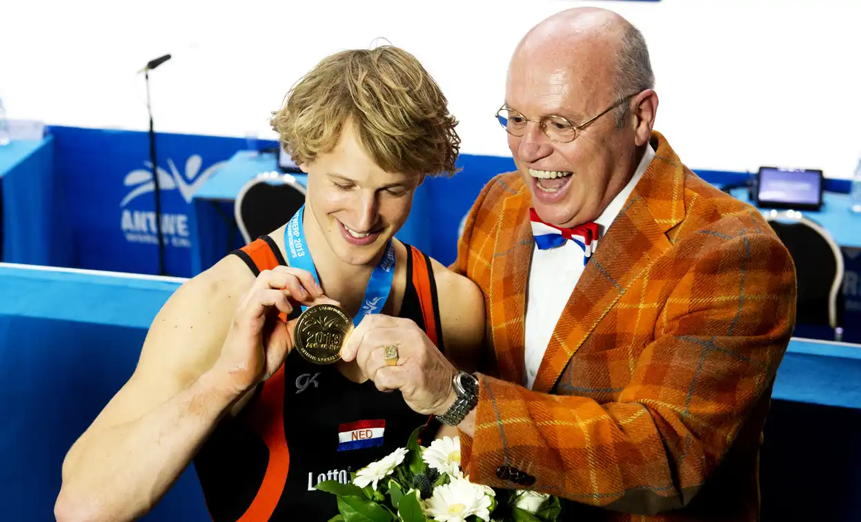En zo geschiedde, de turner won goud. Tegen het einde van de oefening hield Van Zetten het niet meer: “En dan nu de allesbeslissende afsprong… En hij staat! Hij stáát! Iedereen hier staat! En ik sta ook! Ik ga helemaal uit mijn dak!”