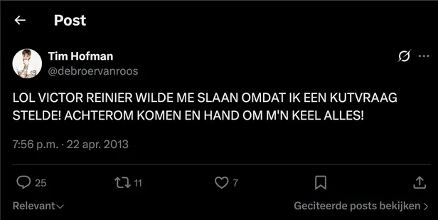 Dat maakt het ietsje concreter, maar ook niet veel. Toch heeft de acteur de schijn tegen, want het is zeker niet de eerste keer dat hij vervelend in het nieuws komt. Tim Hofman (BOOS) laat nooit een kans onbenut om zich negatief uit te laten over Reinier, dat deed hij ook rond het ontslag bij Flikken Maastricht. Dat voert terug op een incident uit 2013, Hofman werd toen nog niet geplaagd door een Jezus Christus-syndroom, maar stelde brutale vragen als verslaggever van Spuiten en Slikken. Bij een première provoceert hij Reinier met de vraag: “Nooit meer seks, of seks met je moeder?”